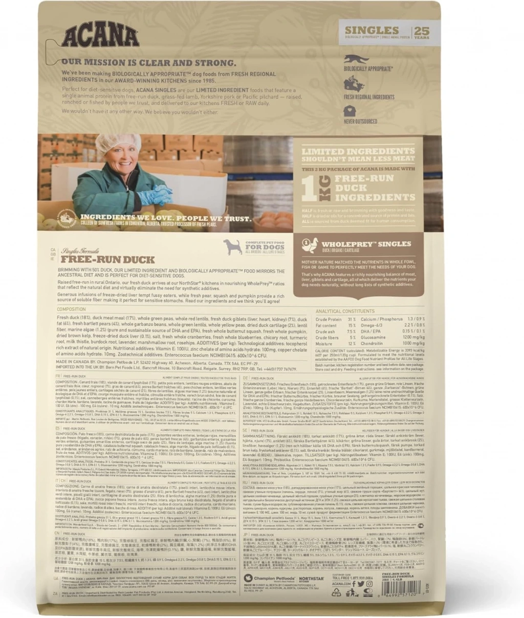 ACANA Free-Run Duck bildiğimiz ve güvendiğimiz insanlar tarafından yetiştirilen ya da avlanan, "insan tüketimine uygun olarak addedilen ve her gün ödüllü NorthStar mutfaklarımıza taze olarak teslim edilen benzersiz yöresel içerikleri bir arada sunmaktadır.Taze ördek (%18), Ördek eti (%17), Bütün yeşil bezelye, Bütün kırmızı mercimek, taze ördek sakatatları (ciğer,yürek,böbrek) (%7), Ördek yağı (%6), Taze barlett armudu (%4), Bütün garbanzo nohutu, Bütün yeşil mercimek, Bütün sarı bezelye, Kurutulmuş ördek kıkırdağı (%2), Mercimek lifi, Deniz yosunu (%1.2) (saf ve sürdürülebilir DHA ve EPA kaynağı), Taze bal kabağı, Taze kabak, Kurtulmuş esmer su yosunu, Dondurularak-kurutulmuş ördek ciğeri (%0.1), salt, Taze kızılcık, Taze yaban mersini, Radika kökü, Zerdeçal kökü, Devedikeni, Dulavraotu kökü, Lavanta, Hatmi kökü, Kuşburnu.Takviye : E Vitamini, Çinko, Bakır. Doğal olarak E vitamini ile korunmaktadır.