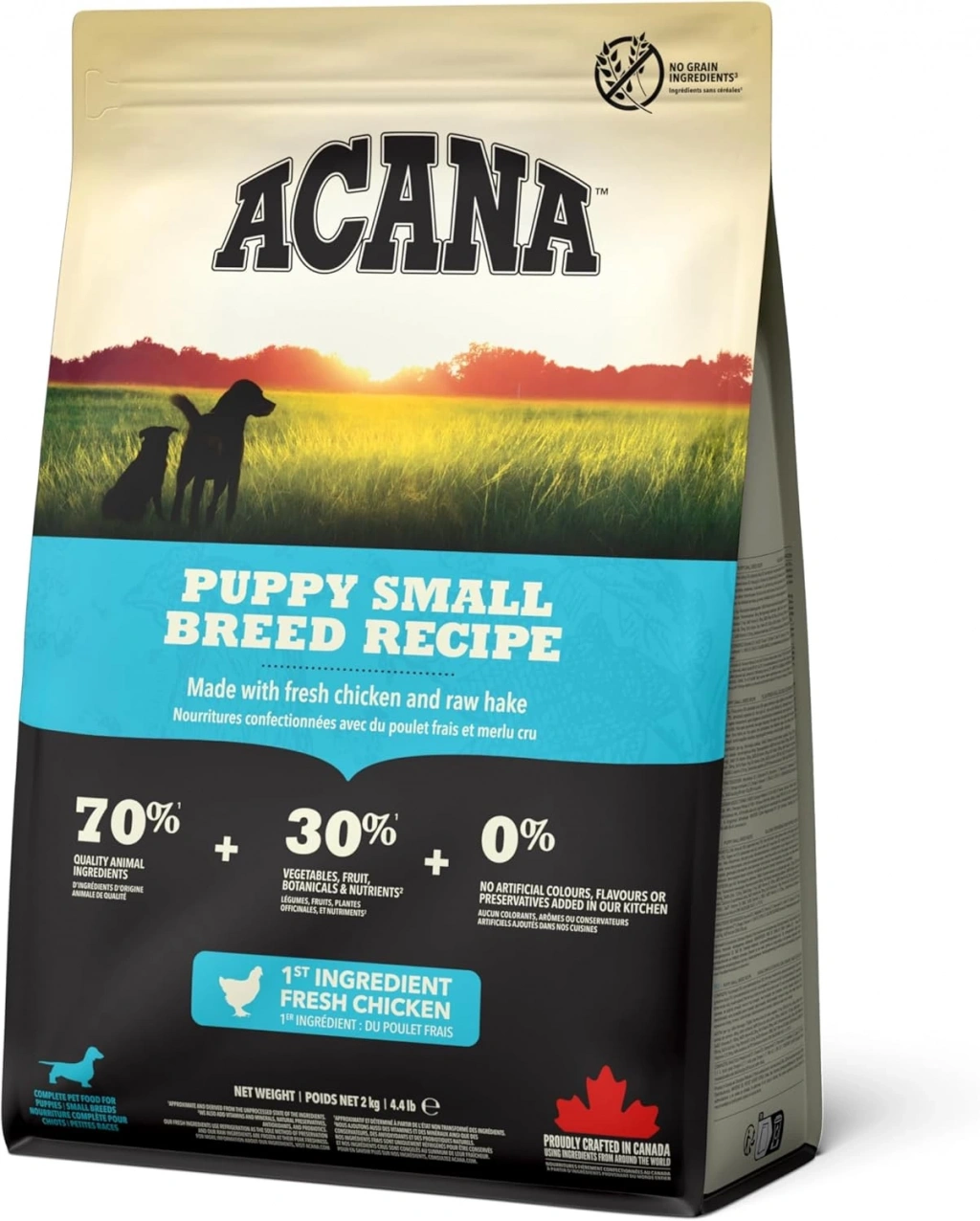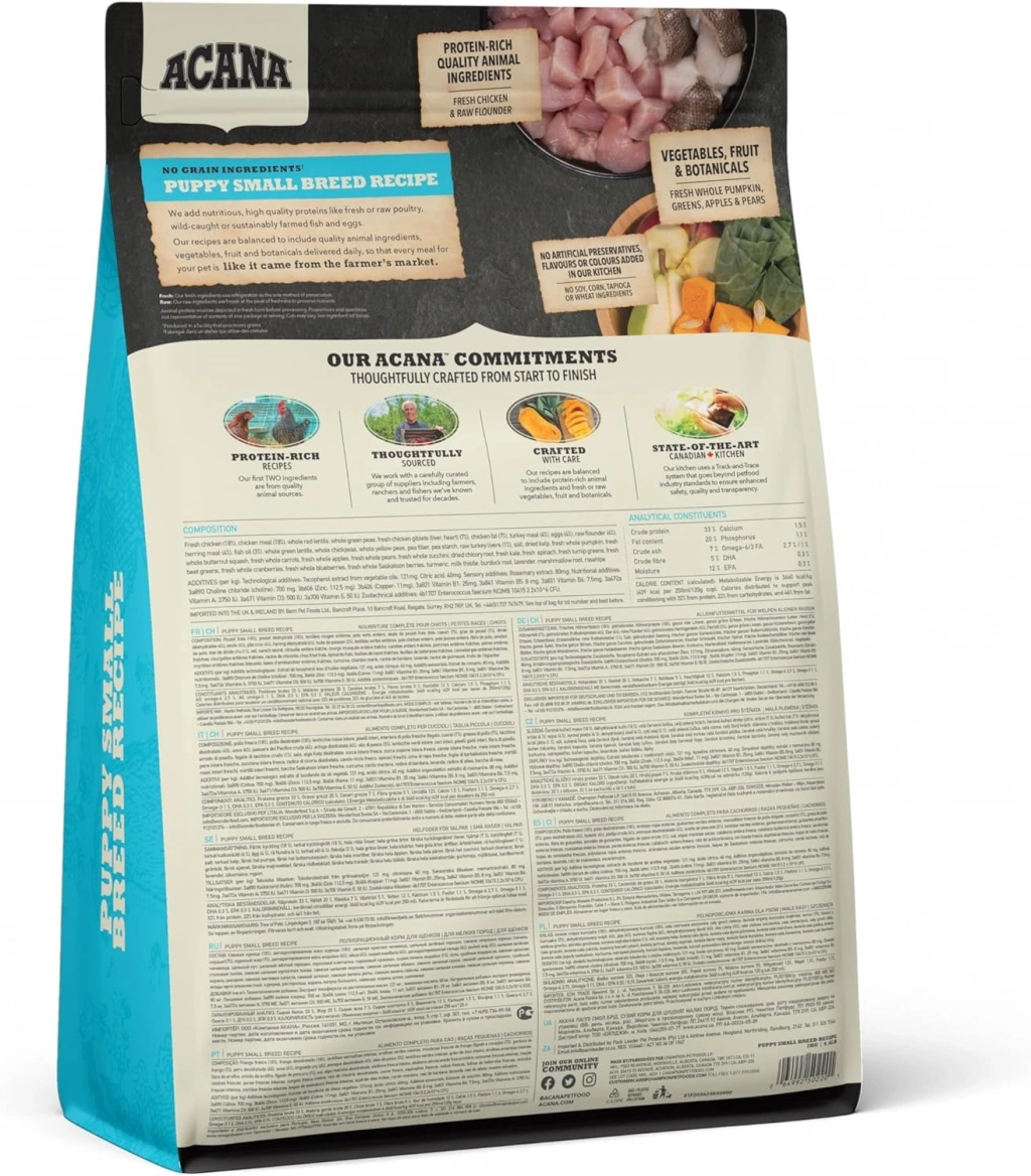 Küçük cins yavrular çok çabuk gelişirler ve bu süratli fiziksel gelişmelerini destekleyecek, nitelikli et proteinleri ve yağları açısından zengin, üst düzeyde besleyici niteliği olan bir beslenme tarzına ihtiyaç duyarlar.İçeriğinin yüzde 65'inin tamamen et ürünlerinden meydana geldiği ACANA PUPPY SMALL BREED, kümes veya fabrikalarda değil, doğal koşullarda yetişmiş tavuk,yerel çiftliklerimizden elde ettiğimiz bütün yumurta, Vancouver Adasından gelen dil balığı kendi bölgemizden GÜNLÜK ve TAZE temin edilmekte olan ve hiç bir şekilde dondurulmamış, koruyucu katkı maddeleri ilave edilmemiş insan tüketimine uygun vasıfta malzemeler ile dopdoludur.