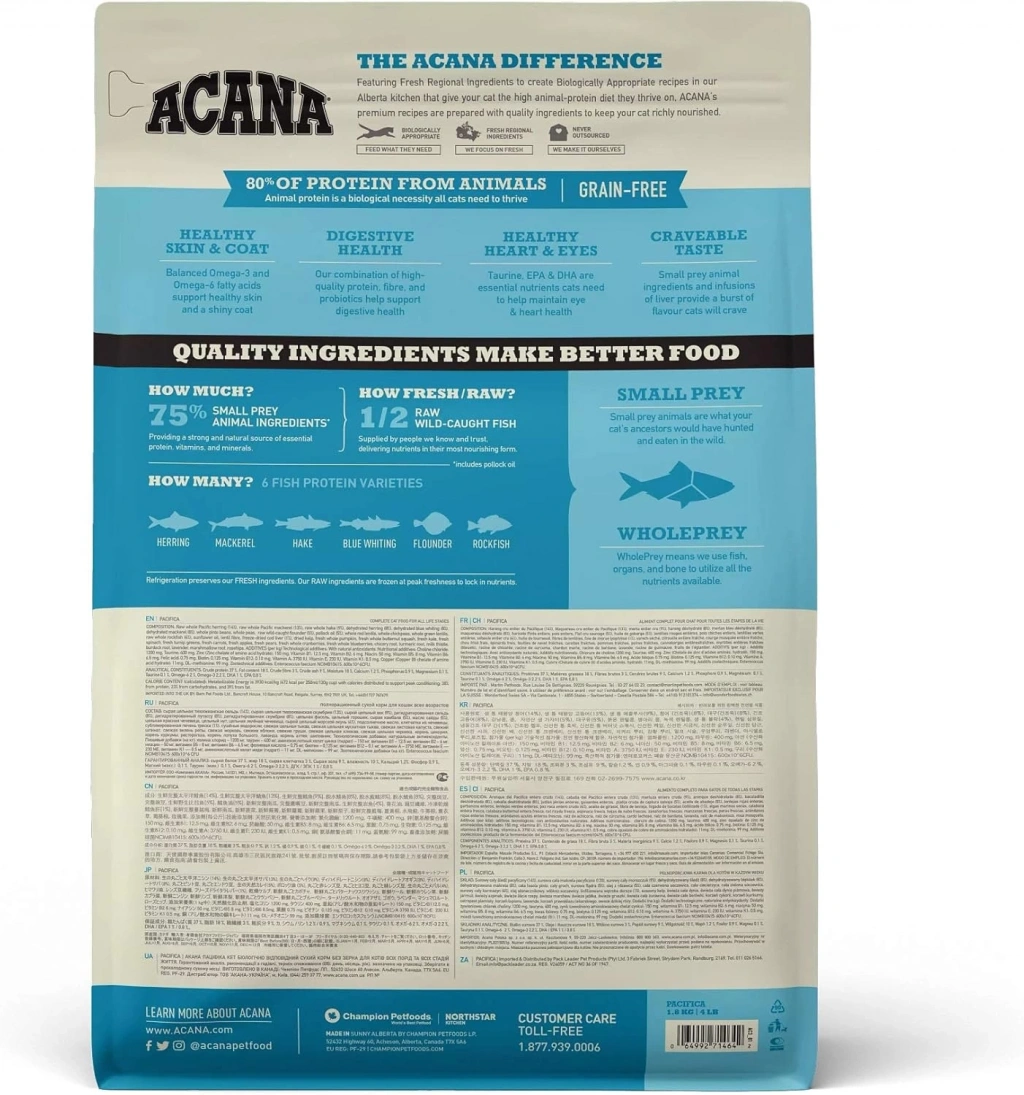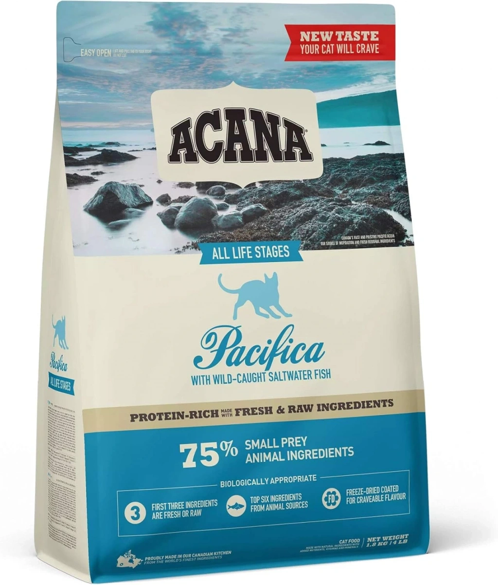 Kediler için tam besleyici mama olan Acana Pacifica, evcil hayvan maması üretiminde hayvanların doğal yaşamdaki beslenme alışkanlıklarını örnek alarak oluşturulan formüle sahiptir. %65'i günlük elde edilen taze ringa balığı, uskumru ve pasifik berlamından üretilen mama hiçbir katkı maddesi içermemektedir.