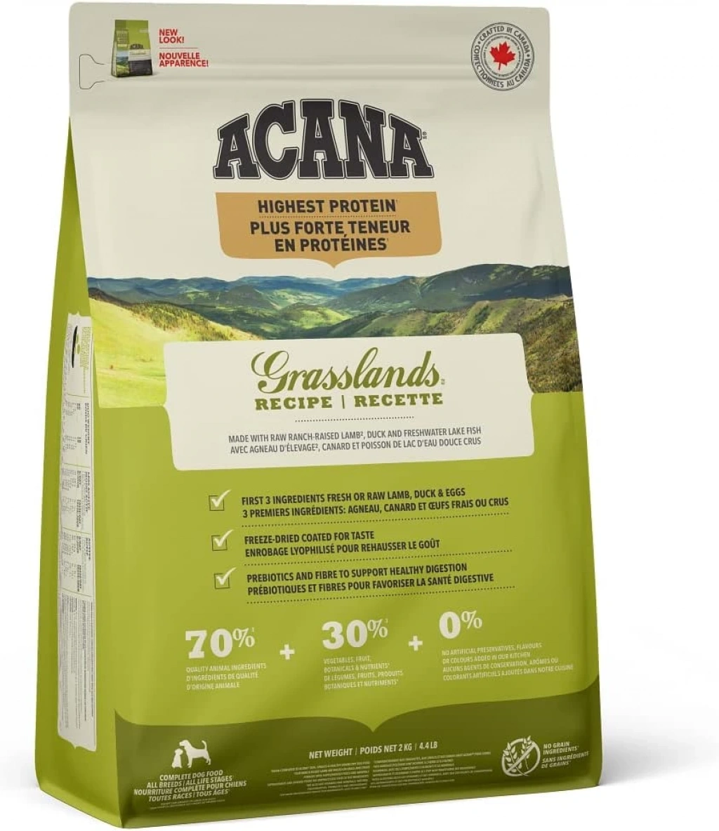 Geniş otlaklarımızdan ve kuzey göllerimizden ilhamını alan ACANA Grasslands batı Kanadanın taze kuzu, serbest dolaşan ördek, bütün kuluçka yumurtaları, serbest avlanan kuzey turna balığı ve serbest dolaşan hindi içeriklerini sunmaktadır.