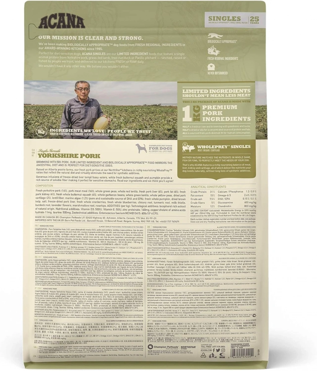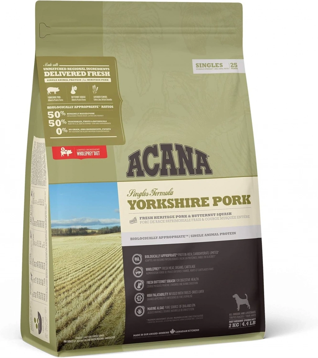 ACANA Yorkshire Pork %50 domuz ile sınırlı içerikli, tek, kolay sindirilebilir hayvansal protein içeren tüm ırk ve yaş evrelerinde beslenme hassasiyeti olan köpekler için ideal bir mamadır.