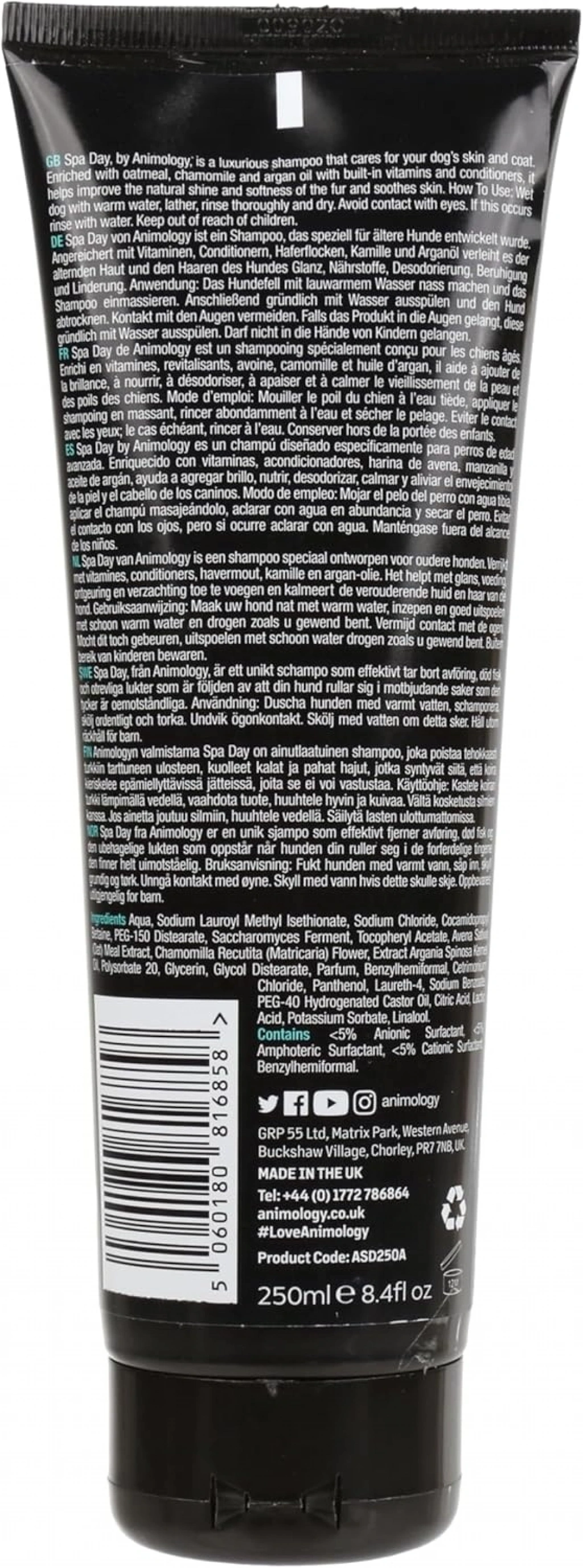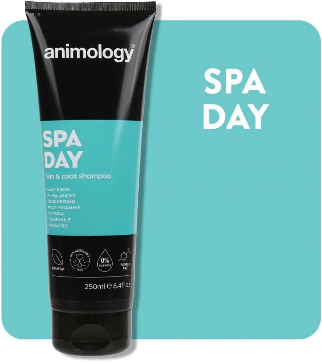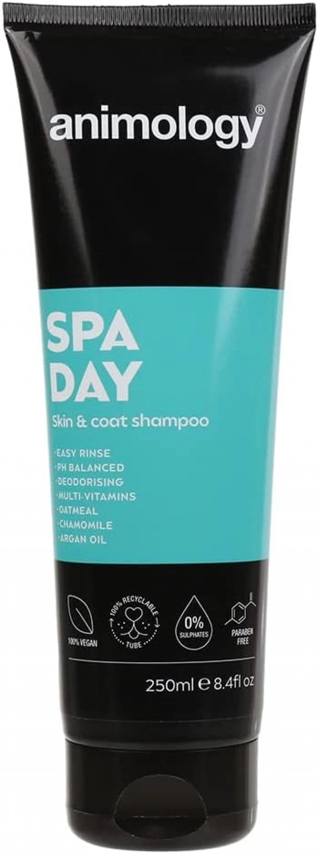 Animologyden Spa Day, köpeğinizin derisine ve tüylerine özen gösteren lüks bir şampuandır. Yerleşik vitaminler ve yumuşatıcılar ile yulaf ezmesi, papatya ve argon yağı ile zenginleştirilmiş, kürkün doğal parlaklığını ve yumuşaklığını geliştirmeye yardımcı olur ve cildi rahatlatır.