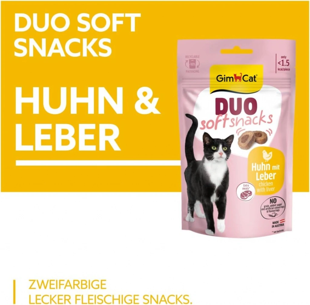 GimCat Duo Soft Snacks Chicken with Liver kediniz için yüksek et ve balık içeriğine sahip lezzetli ödüllerdir.