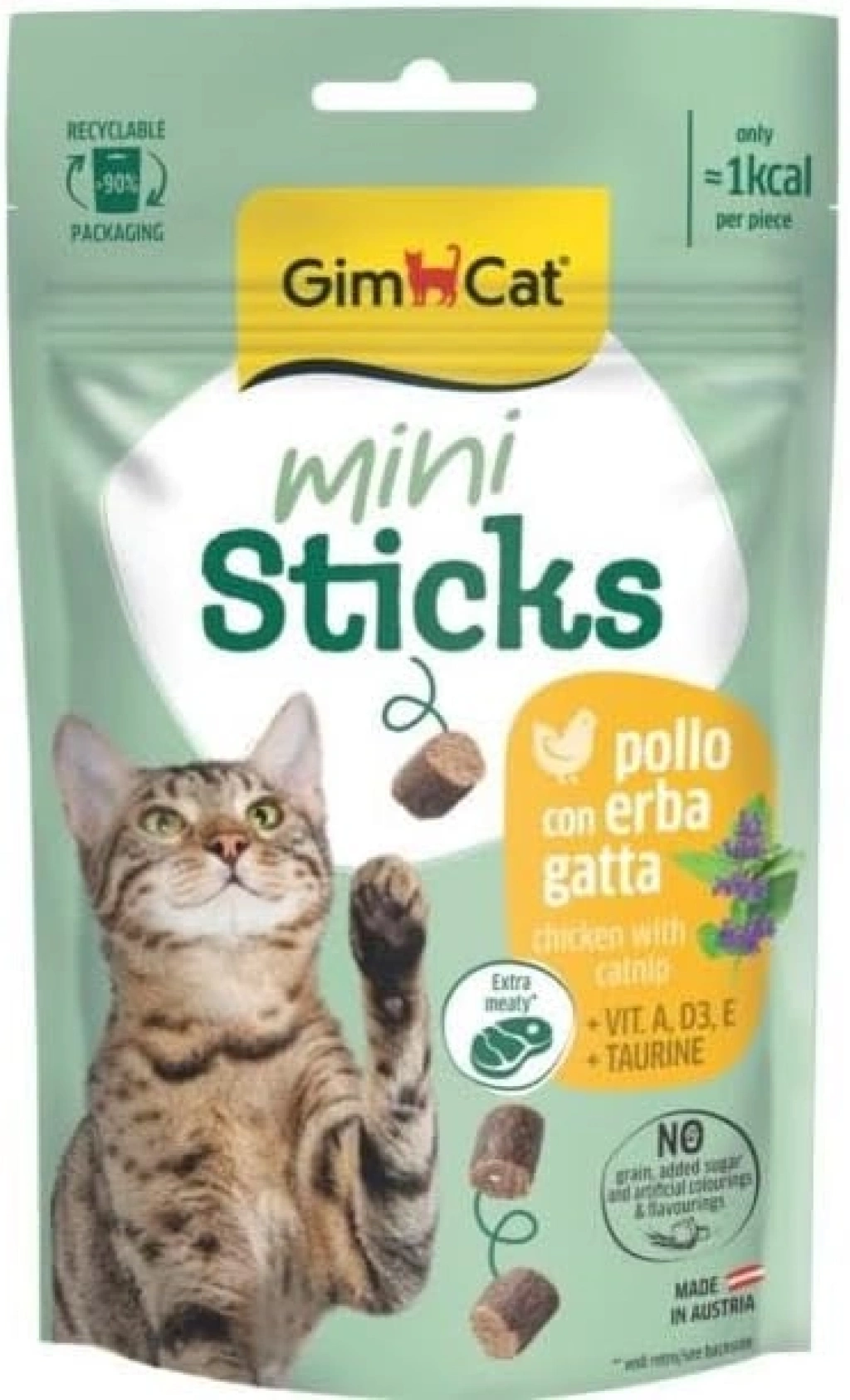 GimCat Mini Sticks tavuklu ve kedi naneli, kediniz için yüksek et içeriğine sahip, karşı konulamaz derecede lezzetli bir atıştırmalıktır.İçeriğinde Vitamin A, D4, E Vitamini ve Taurin bulunmaktadır.