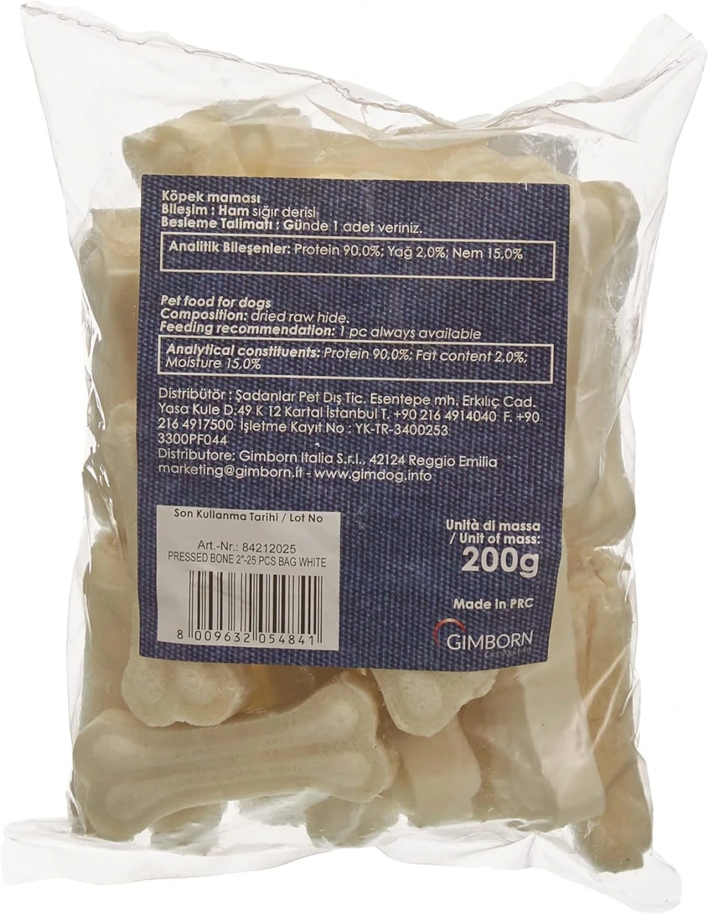 GIMDOG MORDIMI PRESS KEMİK 2 25Lİ WHITE 200gr Barkod: 8009632054841 Ürün Özellikleri; Gimdog çiğneme kemikleri köpekler için harika bir ödüldür. %100 hayvan derisinden üretilmiş olan bu kemikler son derece kaliteli ve ürün çeşitliliği bakımından zengindir. Köpeklerin kemirme ihtiyaçlarını giderirken aynı zamanda mekanik etkisi sayesinde daha sağlıklı bir diş ve diş eti oluşumunu sağlar. Sağlıklı diş ve dişetine sahip köpeklerde ağız kokusu oluşumunu engeller. Bileşim Ham Sığır Derisi Beslenme Talimatı Günde 1 adet veriniz. Analiz Değerleri : Nem 15.00 % Ham Protein 90.00 % Ham Yağ 2.00 % Menşei : Çin