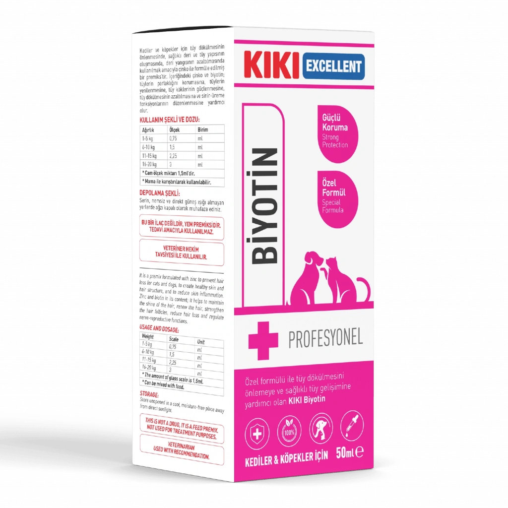 Evcil hayvanların sağlıklı bir tüy ve deri yapısına sahip olması, yalnızca estetik bir kaygı değil, aynı zamanda sağlıkla da ilgili bir konudur. KIKI Excellent Biyotin Şurup, tüy dökülmesini azaltır ve tüylerin yenilenmesini destekler. Bu, evcil hayvanların tüylerinin sağlıklı kalmasına yardımcı olurken, cildin de sağlıklı olmasını sağlar. Özellikle tüy dökme mevsimlerinde veya cilt problemleri yaşayan hayvanlar için bu tür bir destek, onların rahatlamasına ve sağlıklarının korunmasına büyük ölçüde katkıda bulunur.