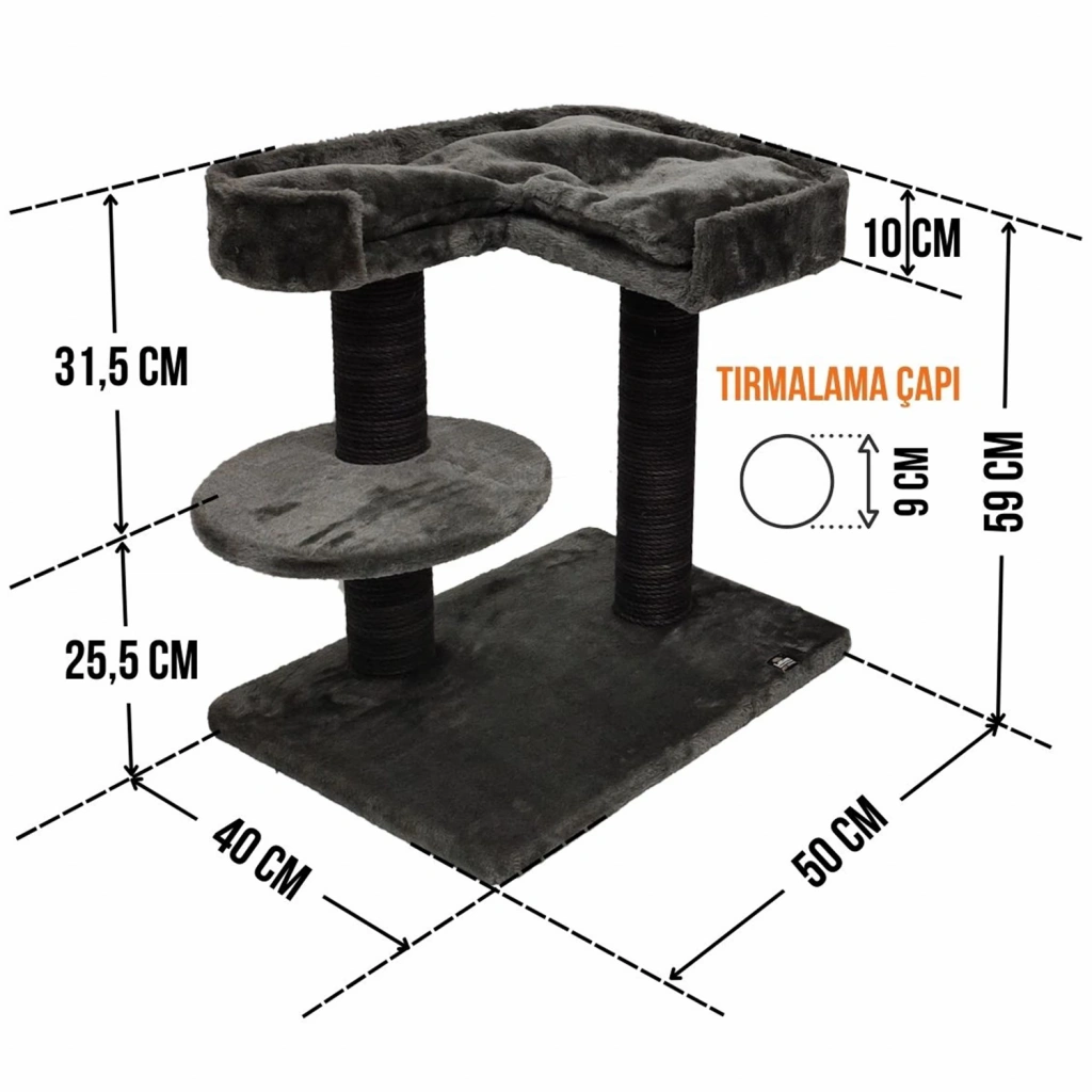Tırmalama direklerinde kullanılan 6mm doğal jüt halat, masuralara her noktadan yapıştırılarak sağlamlık en üst düzeye çıkarılmıştır. Tırmalama direklerinin alt ve üst kapaklarında MDF kullanılmaktadır.