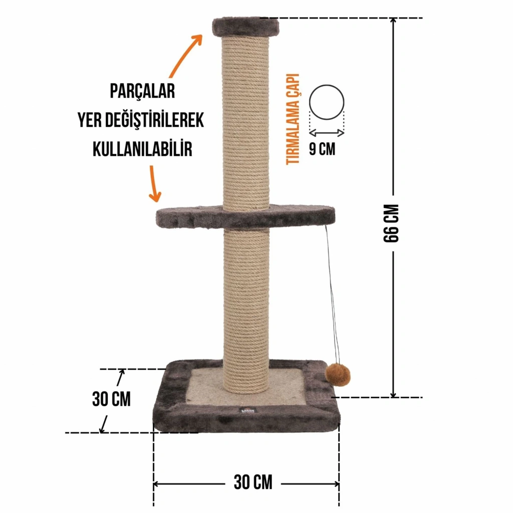 Tırmalama direklerinde kullanılan 6mm doğal jüt halat, masuralara her noktadan yapıştırılarak sağlamlık en üst düzeye çıkarılmıştır. Tırmalama direklerinin alt ve üst kapaklarında MDF kullanılmaktadır.