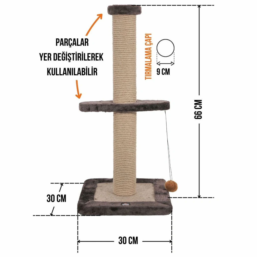 Tırmalama direklerinde kullanılan 6mm doğal jüt halat, masuralara her noktadan yapıştırılarak sağlamlık en üst düzeye çıkarılmıştır. Tırmalama direklerinin alt ve üst kapaklarında MDF kullanılmaktadır.