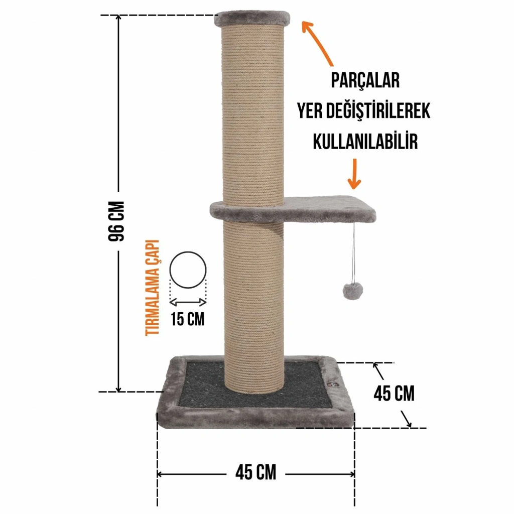 Tırmalama direklerinde kullanılan 6mm doğal jüt halat, masuralara her noktadan yapıştırılarak sağlamlık en üst düzeye çıkarılmıştır. Tırmalama direklerinin alt ve üst kapaklarında MDF kullanılmaktadır.