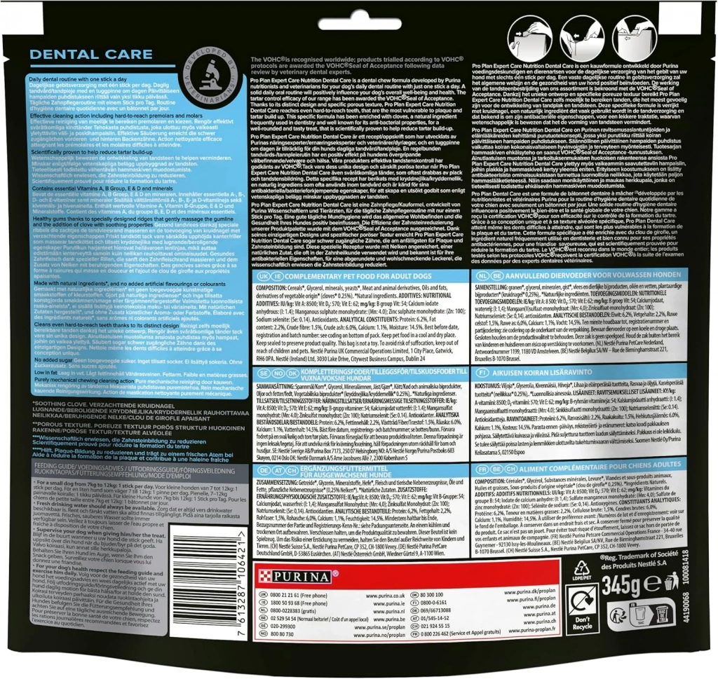 Pro Plan Expert Care Nutrition Dental Care, Purina beslenme uzmanları ve veteriner hekimler tarafından köpeğinizin günlük diş hijyeni rutini için günde sadece bir çubukla geliştirilen bir diş çiğneme çubuğu formülüdür. Sağlam bir diş hijyeni rutini, köpeğinizin refahını ve genel sağlığını olumlu yönde etkileyecektir. Ürün yelpazemiz, tartar oluşumunu kontrol etmedeki etkinliği nedeniyle VOHC sertifikasını almıştır. Pro Plan Expert Care Nutrition Dental Care, benzersiz tasarımı ve özel çukurlu dokusu sayesinde plak ve tartar oluşumuna en yatkın, ulaşılması zor dişlere bile ulaşır. Bu özel formül, diş hekimliğinde sıklıkla kullanılan ve antibakteriyel özellikleriyle bilinen doğal bir içerik olan karanfil ile zenginleştirilerek lezzetli bir ikram için tartar oluşumunu azalttığı bilimsel olarak kanıtlanmıştır.