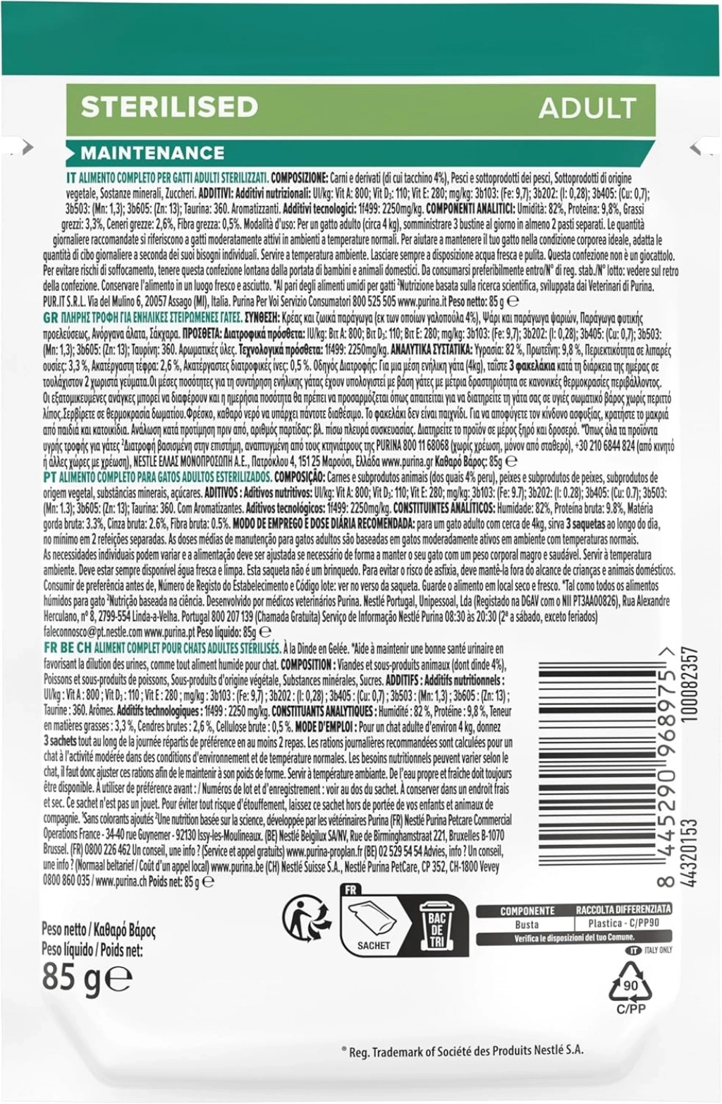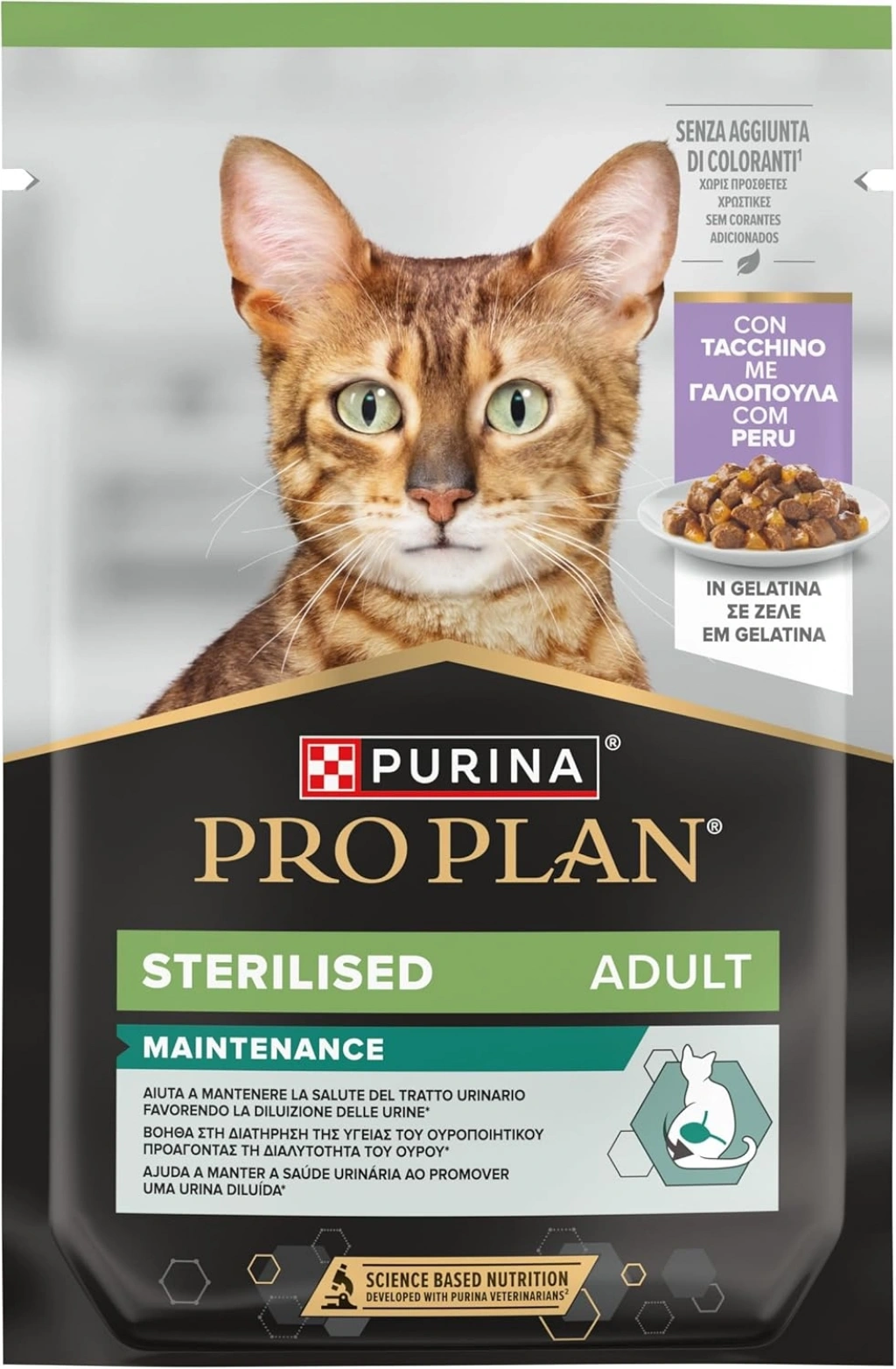 Purina Pro Plan. Yetişkin kısırlaştırılmış kediler için hindi etli, poşetlerde tam mama. Jöle parçacıkları.