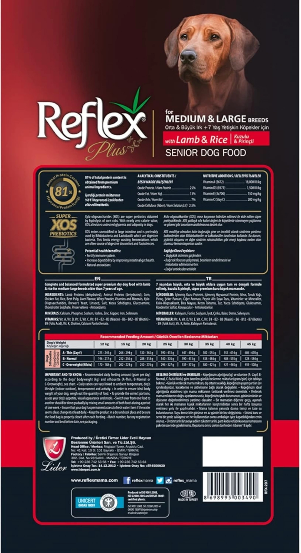 Reflex Plus For Medium & Large Breeds with Lamb& Rice, tüm yetişkin orta ve büyük ırklar için günlük beslenme ihtiyaçlarını karşılamak üzere kedi/köpek beslenme uzmanları tarafından özenle formüle edilmiş tam ve dengeli, kuzu proteini içeren süper premium köpek mamasıdır.Ksilo-oligosakkaritler (XOS),mısır koçanının hidrolize edilmesi ile elde edilen süper prebiyotiklerdir.