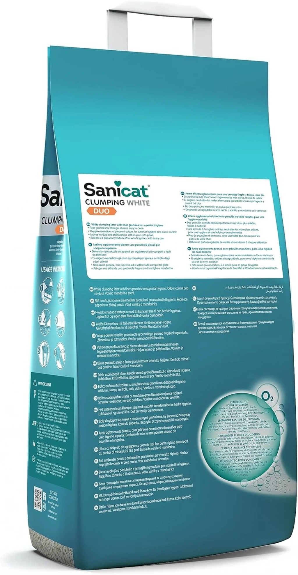 SaniCat Duo %100 doğal bentonit kedi kumu vanilya ve mandalin kokusu ve topaklaşma özelliği sayesinde saniyeler içerisinde sıvıyı emer ve bu şekilde bulunduğu ortamda koku oluşmasına imkan tanımaz.