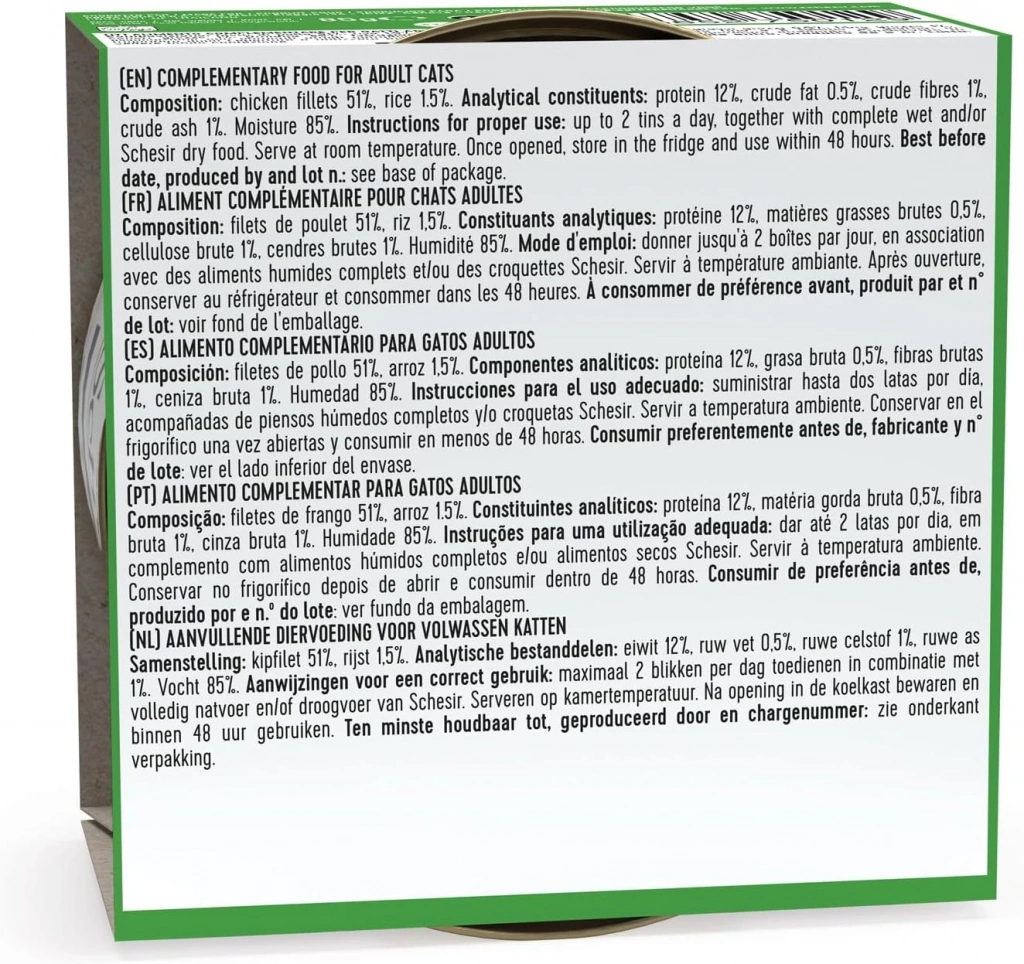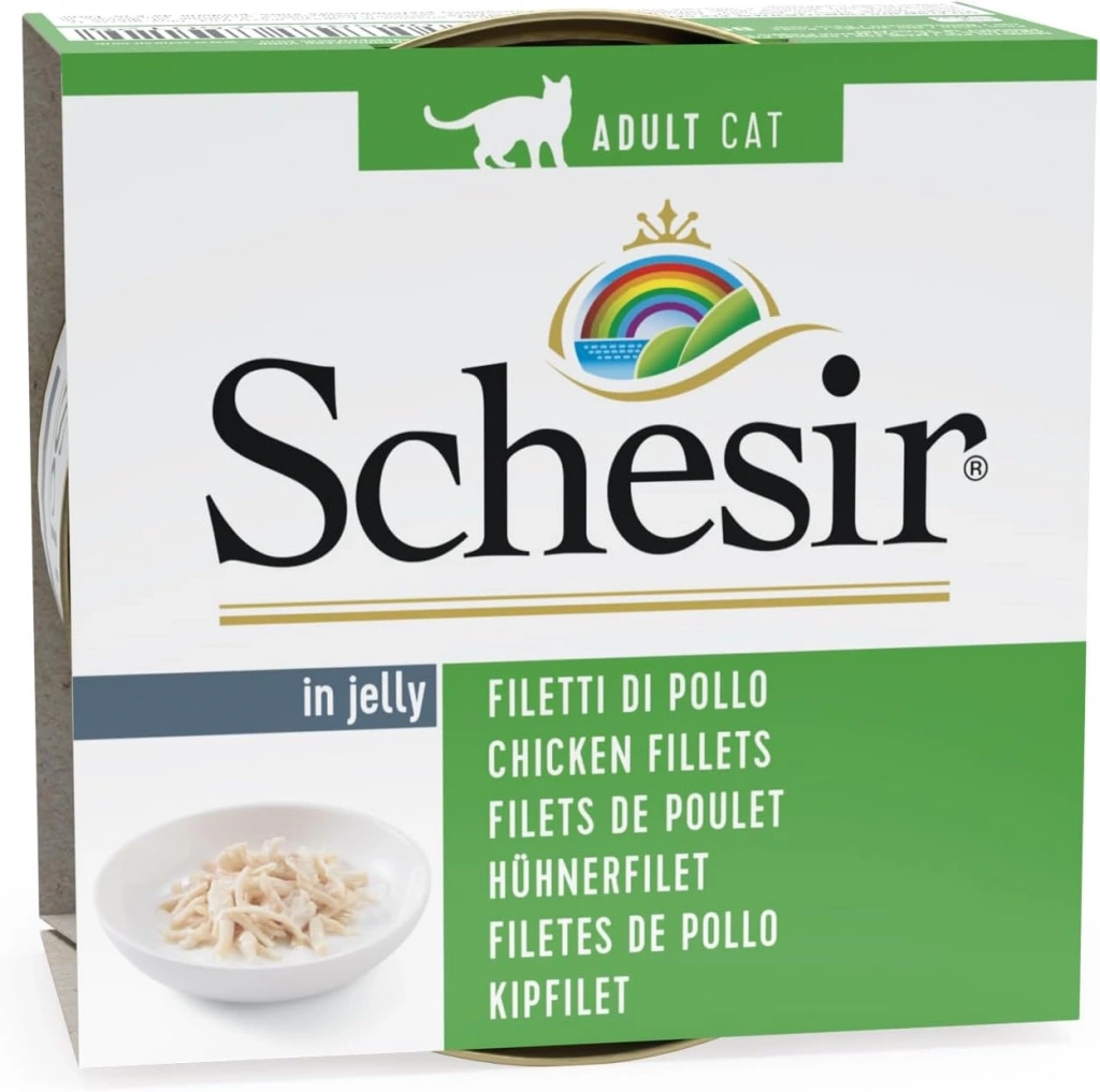 Tam ıslak Schesir doğal tavuk etli konserve kedi konservesi . Tüm gerekli besinleri günlük diyet, mikro ve makro, vitaminler ve taurin içerir. tavuk eti ile hazırlanan lezzetli ve sağlıklı üretimdir. Schesir konserveler renklendirici ve koruyucu madde ilavesi olmadan doğal ve organik üretilmiştir.