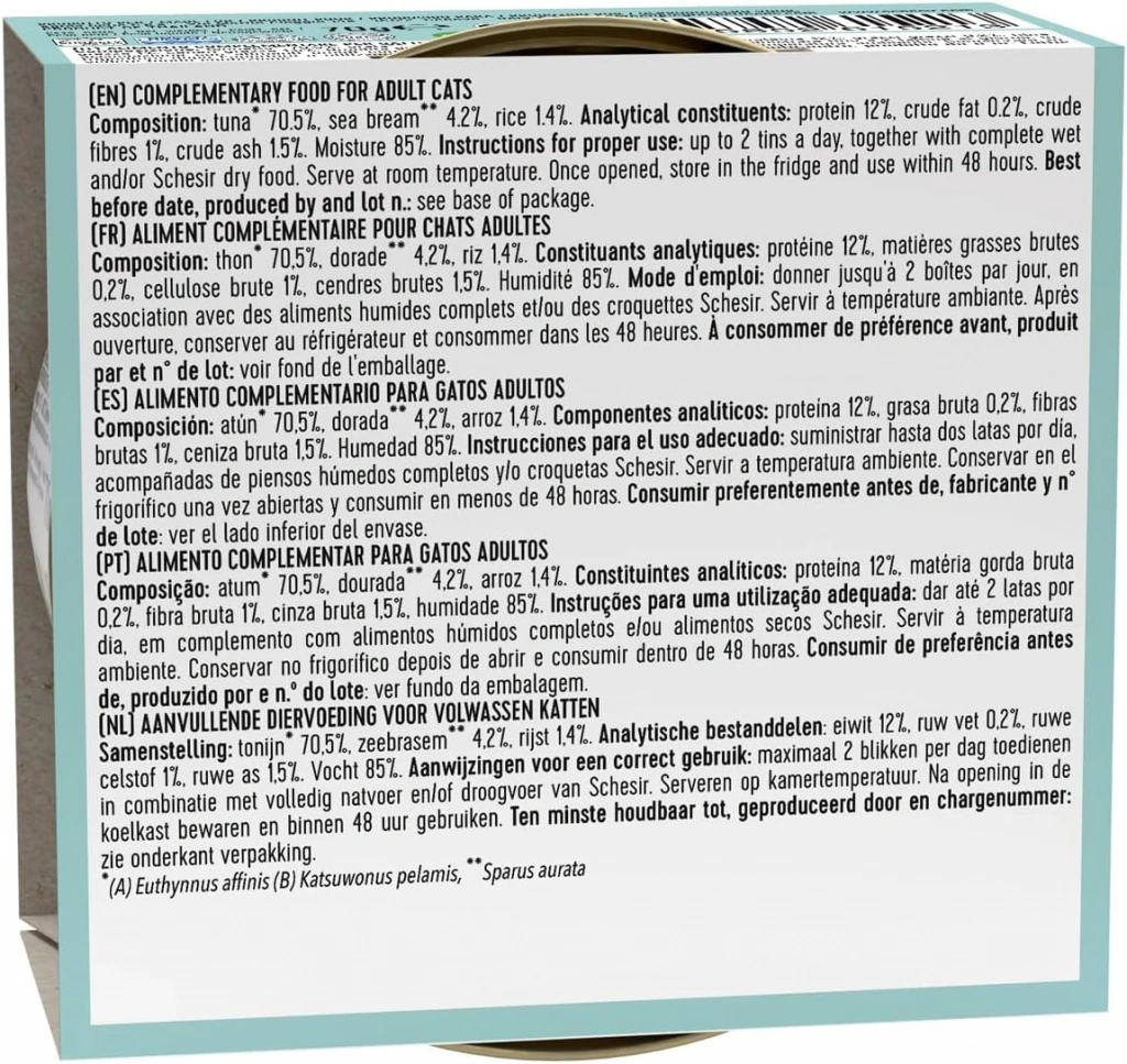 Tam ve dengeli Schesir yaş ve/veya kuru mama ile birlikte günde 2 konserveye kadar tüketilebilir.