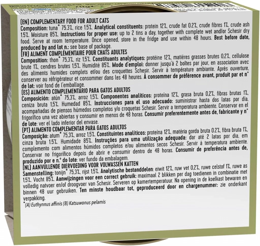Besinler dikkatli işlenmesiyle elde edilmiştir.Yüksek kaliteli ıslak kedi mamasıdır.Sos İçerisinde ton balığı lezzetinde.Tam ıslak Schesir doğal Doğal ton balıklı konserve kedi konservesi . Tüm gerekli besinleri günlük diyet, mikro ve makro, vitaminler ve taurin içerir. Taze Doğal ton balığı ile hazırlanan lezzetli ve sağlıklı üretimdir. Schesir konserveler renklendirici ve koruyucu madde ilavesi olmadan doğal ve organik üretilmiştir.