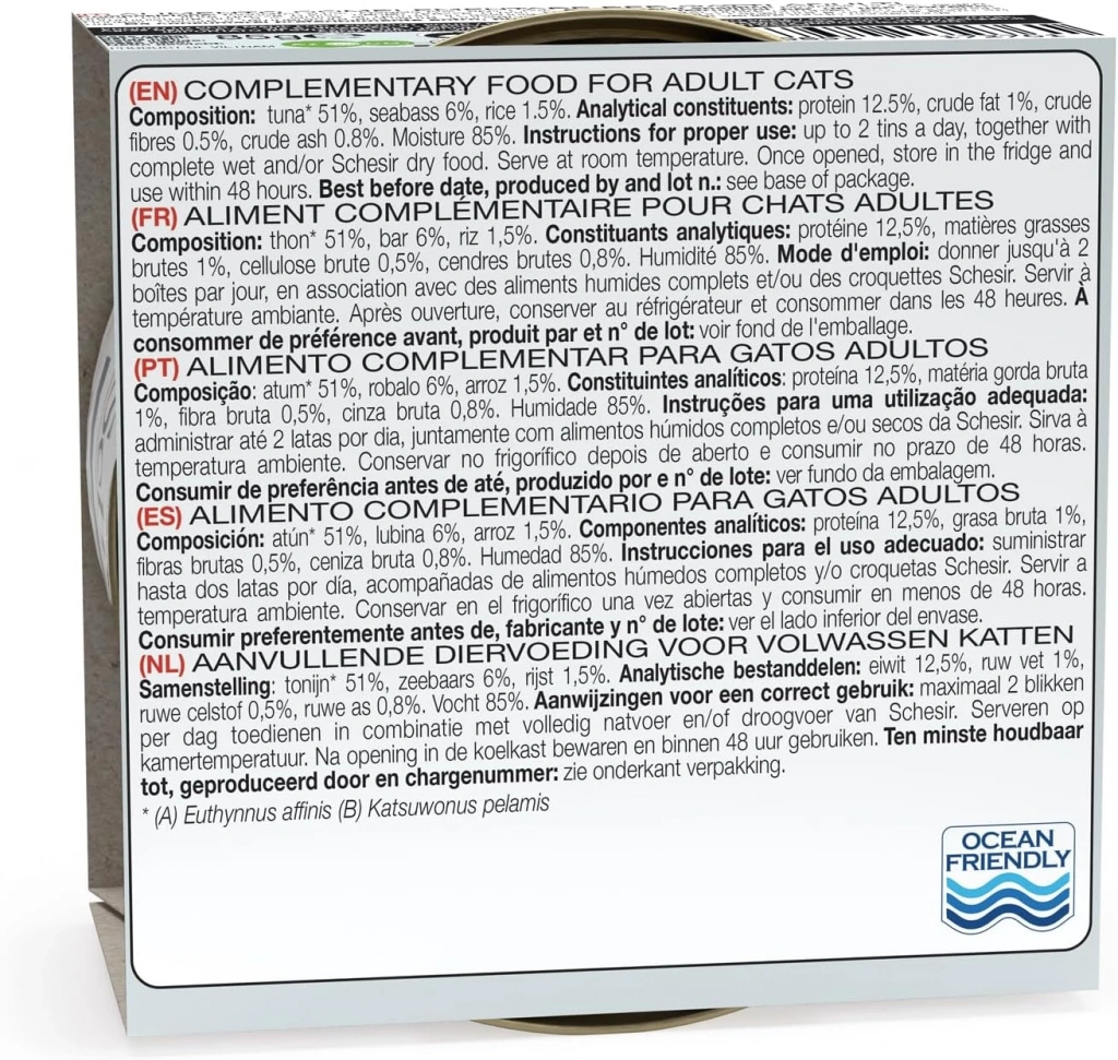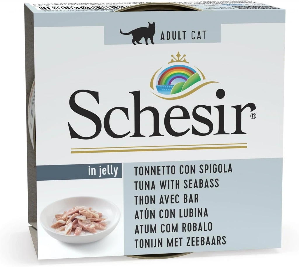 Proteinler ve omega 3 açısından zengin olduğu bilinen bir balık olan levrek ile eşleştirilmiş gerçek ton balığı filetolarına dayalı bir Schesir tarifi . Malzemeler , deniz tadını tercih eden kedileri tatmin etmek için jöle halinde , ancak kasede daha kompakt bir kıvamla hazırlanır .