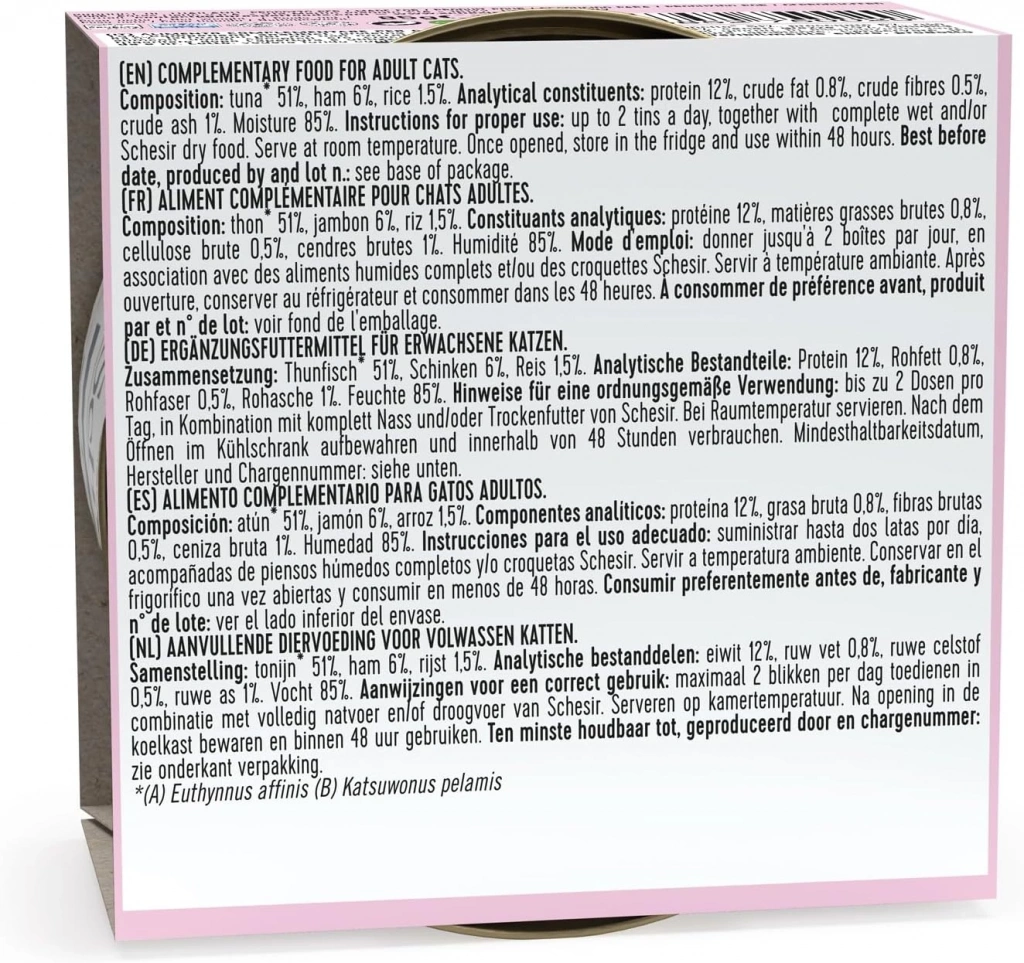 Tam ıslak Schesir doğal ton balığı ve Jambonlu konserve kedi konservesi . Tüm gerekli besinleri günlük diyet, mikro ve makro, vitaminler ve taurin içerir. Taze ton balığı ve Jambon ile hazırlanan lezzetli ve sağlıklı üretimdir. Schesir konserveler renklendirici ve koruyucu madde ilavesi olmadan doğal ve organik üretilmiştir.
